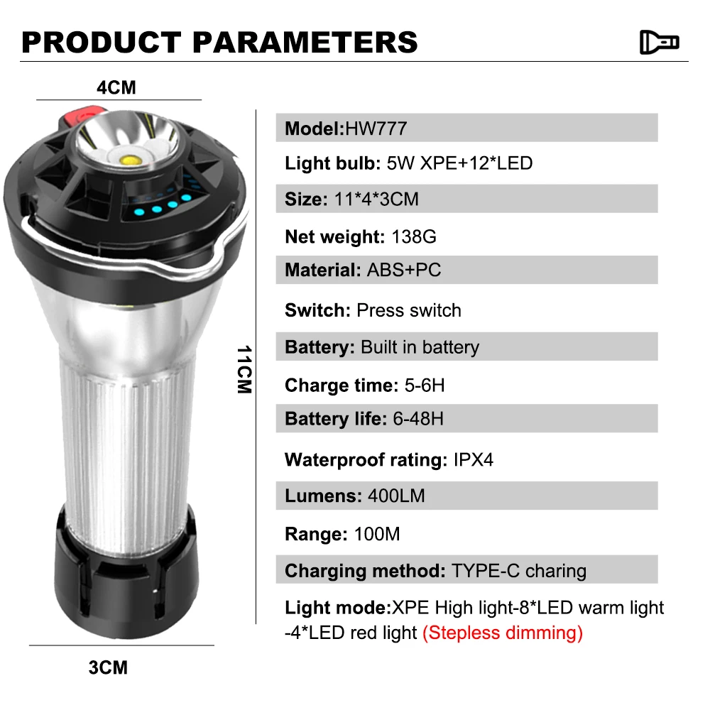 SpecificationModelHW777 camping lightlightXPE+12*LEDbatterybuilt-in batterymater
